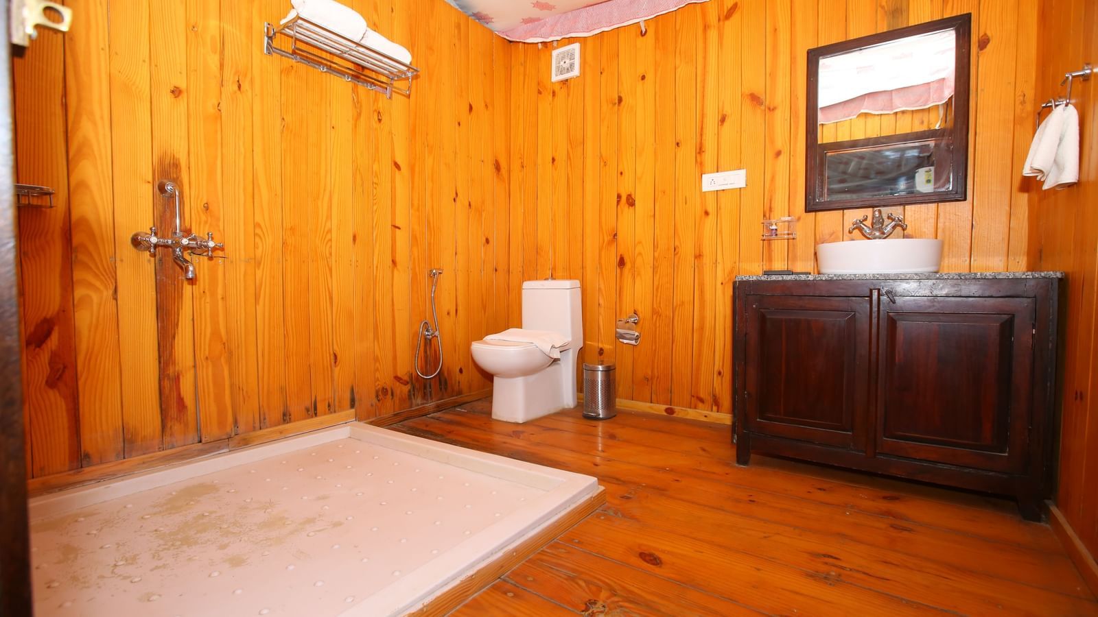 The interiors are bathed in natural light, creating an inviting atmosphere. A stunning glass wall in front of the bed offers breathtaking views of the mountains and mesmerising sunsets.